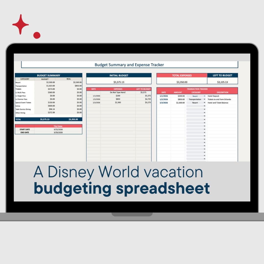 Our spreadsheet helps project your overall budget beforehand, while our expense tracker tab is designed to help you stay on track. If you take a few minutes each day to track expenses, you’ll have a clear picture of what you’re spending. For you that means, less stress, less guilt, and more magic with your family!