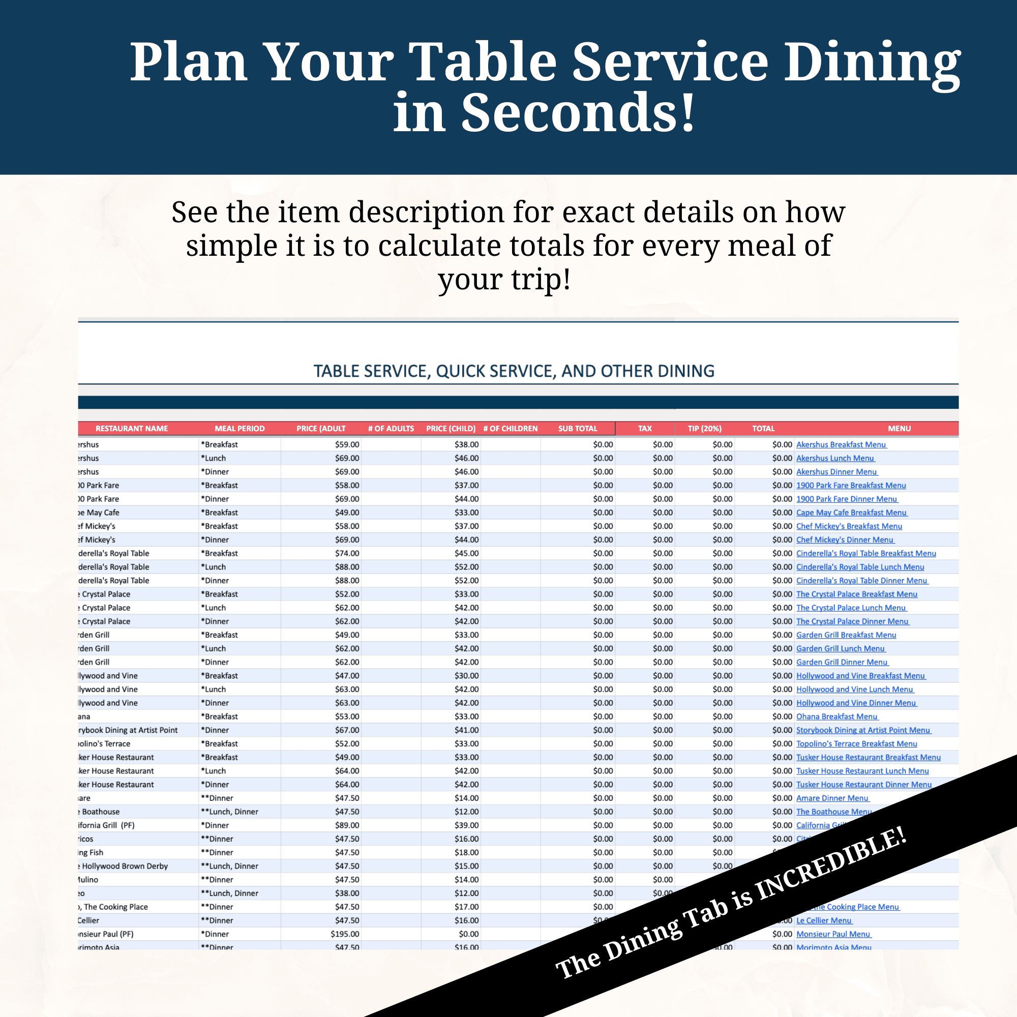 A Dining Table that Leaves No Surprises! Don’t start your vacation day with a pit in your stomach after receiving the check for an outrageous character meal! Our dining table provides estimates of the price of each meal (with tax and tip) based on the number of people in your party. All you need to do is select the number of adults and children who will dine at each table service restaurant. Our formula does the rest!